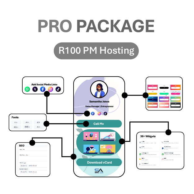 Introducing the Pro package. This is an NFC Bioprofile package that comes with a pvc printed NFC card and your client portal login with full control over your account. This package is linked to a hosting fee of R100 per month.